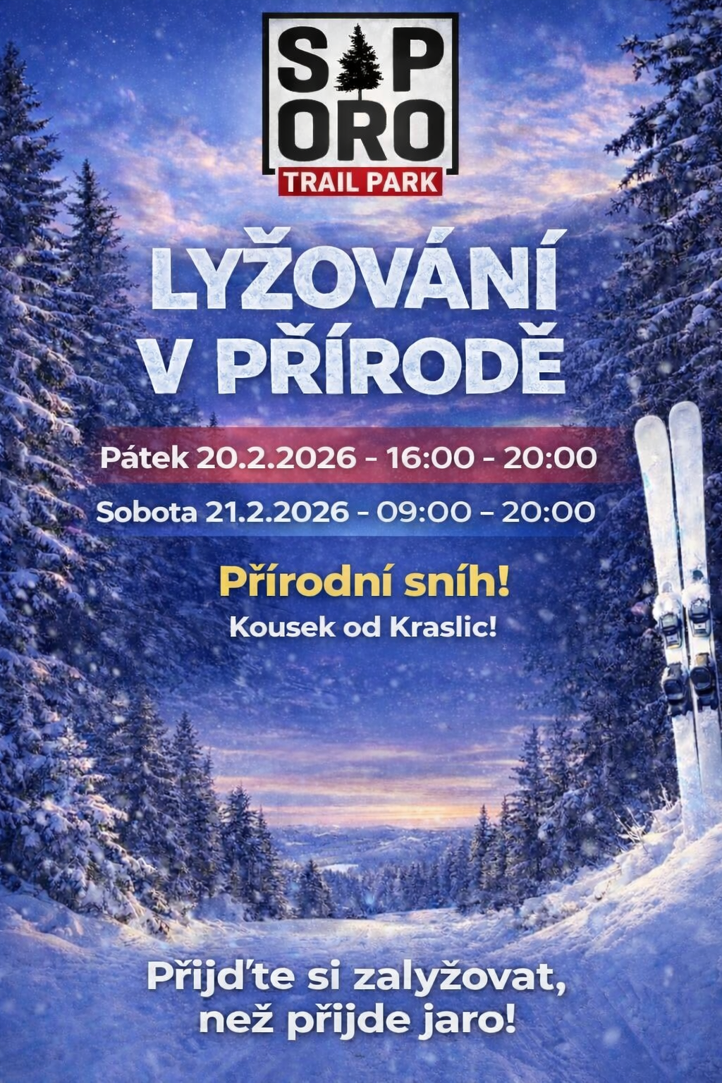 Sněhové podmínky nám přejí a tak přinášíme rozvrh našeho provozu na dalších pár dní. Skiareál SAPORO: 2.2. Pondělí - 16:00-20:00 3.2. Úterý - 16:00-20:00 4.2. Středa - 16:00-20:00 5.2. Čtvrtek - 16:00-20:00 Skiareál KRAJKA: ZAVŘENO Pro další informace o ježdění v následujících dnech a týdnech, v našich kraslických areálech, sledujte naše sociální sítě IG a FB!